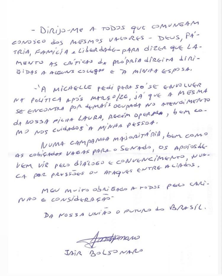 O documento, escrito em papel e assinado de próprio punho, começa com Bolsonaro se dirigindo a “todos que comungam conosco dos mesmos valores – Deus, Pátria, Família e Liberdade”. No trecho inicial, ele afirma lamentar as críticas dirigidas à sua esposa, Michelle Bolsonaro, feitas por alguns dentro da própria direita.