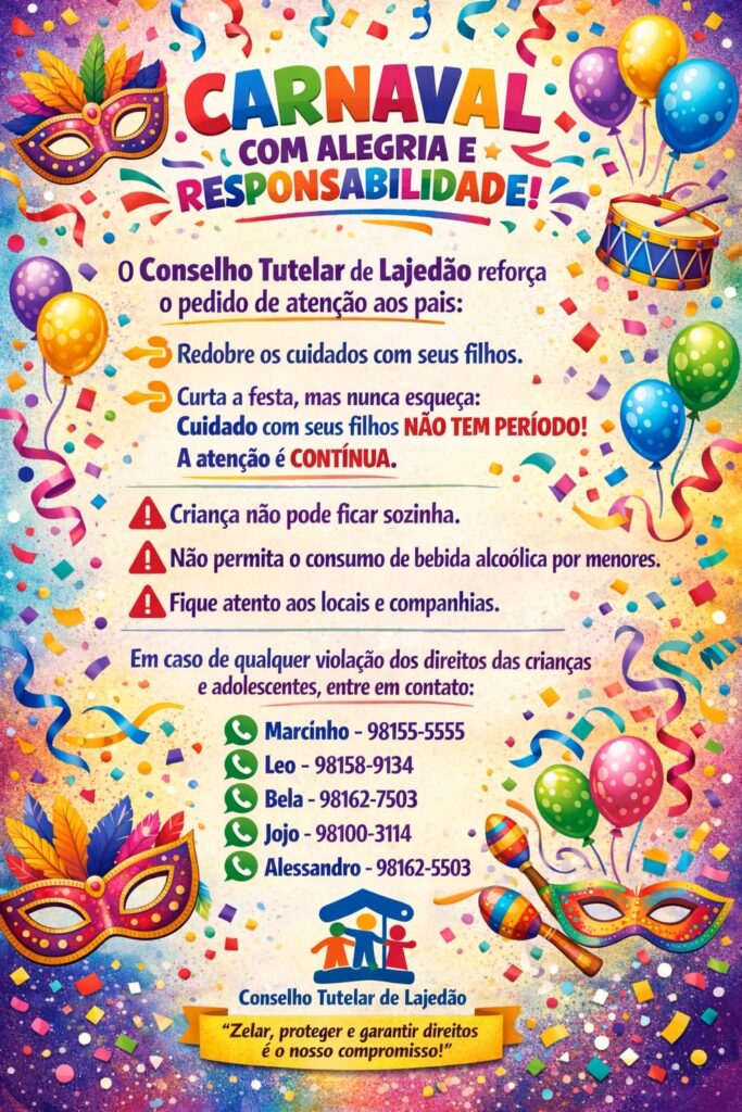 O Conselho Tutelar de Lajedão divulgou um alerta à população com orientações voltadas à proteção de crianças e adolescentes durante o período de Carnaval. A campanha destaca a importância da vigilância constante por parte dos pais e responsáveis durante as festividades.