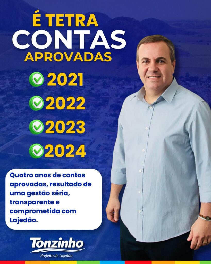 O prefeito de Lajedão, Tonzinho, alcançou um marco expressivo na gestão pública municipal ao ter as contas aprovadas por quatro anos consecutivos, referentes aos exercícios de 2021, 2022, 2023 e 2024. O resultado evidencia a regularidade administrativa e o compromisso com o uso responsável dos recursos públicos.