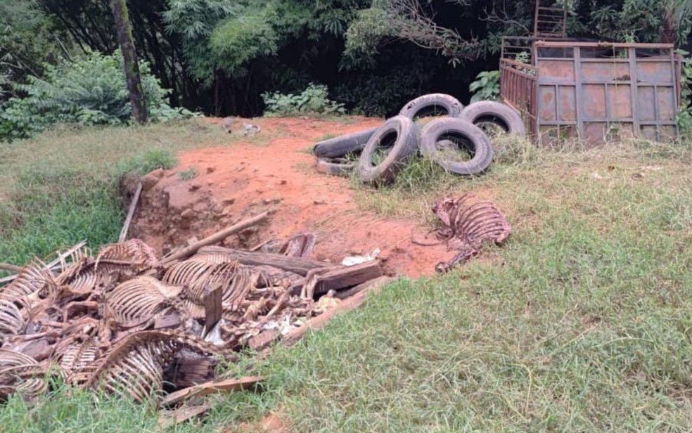 No terreno, foram localizados resíduos de cavalos, incluindo partes de carcaças, cascos, cabeças, sangue e vísceras, todos descartados de maneira irregular, sem qualquer tipo de controle ambiental ou sanitário, caracterizando risco à saúde pública.